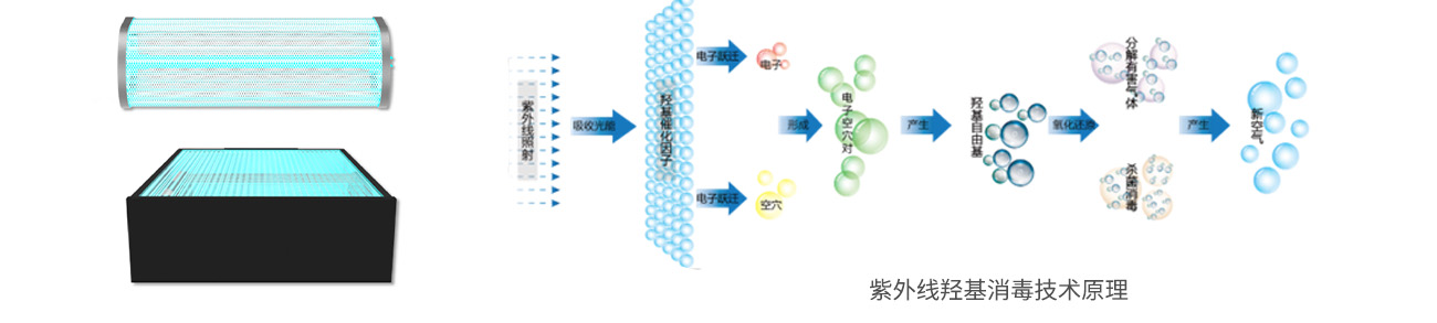 杀菌原理:光触媒是一种纳米级二氧化钛活性材料,它涂布于基材表面,干燥后形成薄膜,在光线的作用下,产生催化降解功能,能有效破坏细菌中的DNA或RNA的分子结构,造成生长性细胞死亡或再生性细胞死亡,达到杀菌消毒的效果。另外触发光源使用双波段紫外线,185nm紫外线照射空气能产生极微量O3,254nm紫外线照射光触媒与O3生成羟基,羟基与紫外线共同作用杀菌。